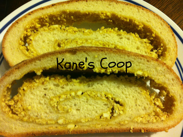 Preheat the oven to 170 degrees and turn it off . Grease the medium sized cookie sheet . Dust the working suraface with little flour and roll the bread dough in about 13x9 rectangle . Spread the paneer bhurji evenly on the rectangle .Roll it tightly making sure less air is trapped in it . Put it seam side down on the cookie sheet .Let it sit in the warm oven for 30 minutes .Take out and make diagonal slits on top of the bread with serrated knief . Preheat the oven to 450 degrees and once it is reached ,reduce it to 400 degrees . Brush the top with little olive oil . Bake for 40 mins .Cool it for 10 minbutes and the bread is ready to be cut .
